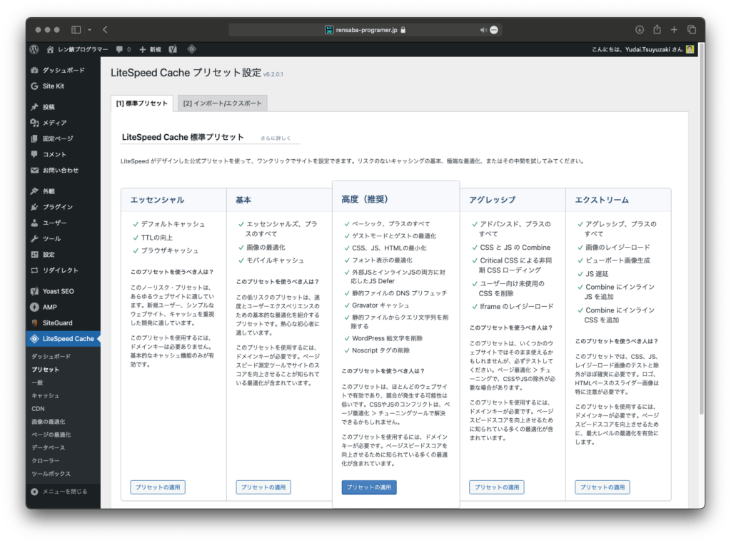 LiteSpeed Cacheを紹介するブログでは、このプリセット設定が存在していなかったりするので、最近実装されたもののようです。かなり便利なプリセット設定となっています。