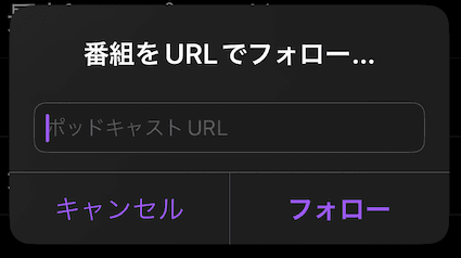 今回の使用用途としては自分だけ or 限られたユーザーで取得すればいいので、ApplePodcastであれば「番組をURLでフォロー」で作成したポッドキャストRSSのURLを入力することで取得することができます。