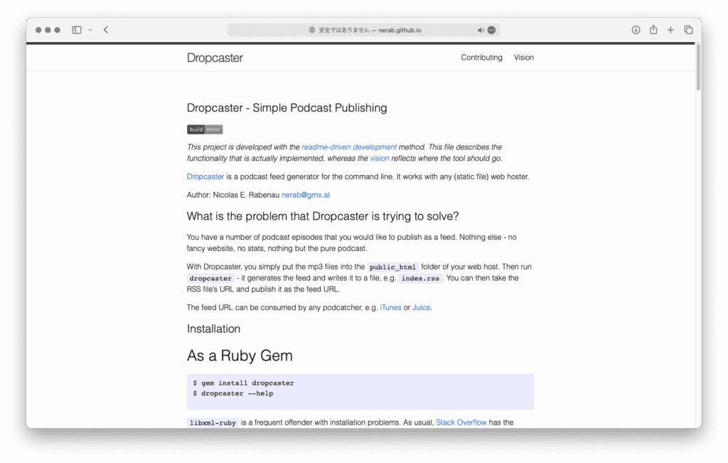 こちらはRubyGemとして公開されており、コマンドライン環境で事前に用意した channel.yml ファイルの設定でmp3ファイルをまとめたディレクトリで実行、作成した結果を xmlとして保存してまとめて公開環境に置く事でポッドキャストが取得することができます。